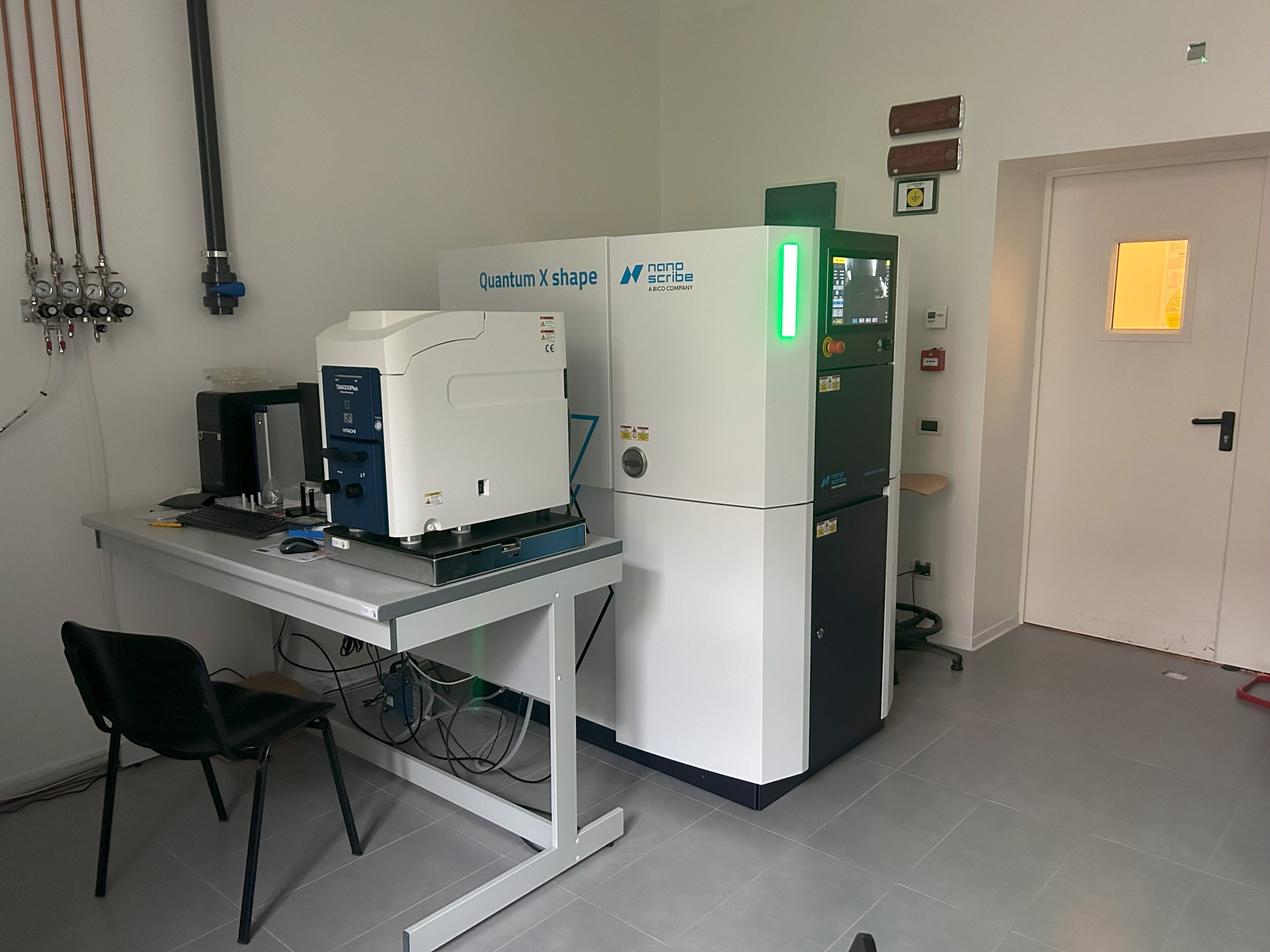 A state of the art lithographic system has been recentely installed at NEST Lab of Scuola Normale Superiore, within the PNRR infrastrucure project named BRIEF, in collaboration with SSSA University. This high-resolution 3D printer is the Quantum X model from NANOSCRIBE and it is the world’s first Two-Photon Grayscale Lithography system for maskless microfabrication of refractive and diffractive microoptics and surface patterning. Their main specification are feature size control in all spatial directions down to 100 nanometers, microscale printing – with typical dimensions from 50 to 700 micrometers – and mesoscale printing – with dimensions up to 25 cm².